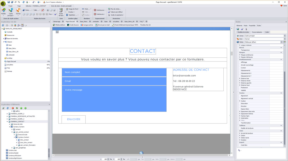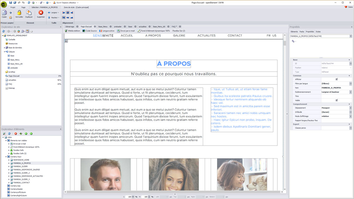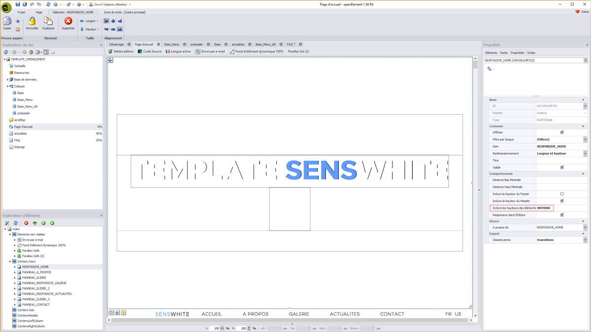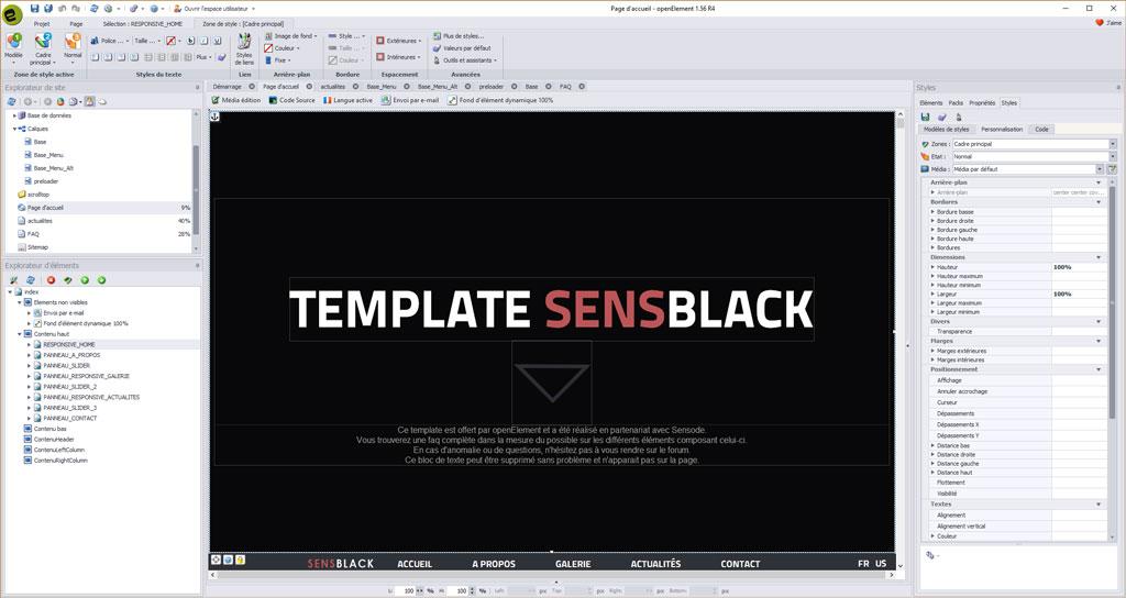 Comme vous pouvez le voir, le template SENSWHITE comporte de tous nouveaux éléments ainsi que du code spécialement développé et intégré au mieux dans Openelement.